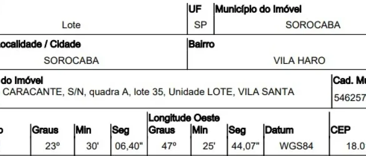 RUA JORGE CARACANTE,N. 00 QD A, LT 35, VILA HARO - CEP: 18015-315, SOROCABA - SAO PAULO nº 00